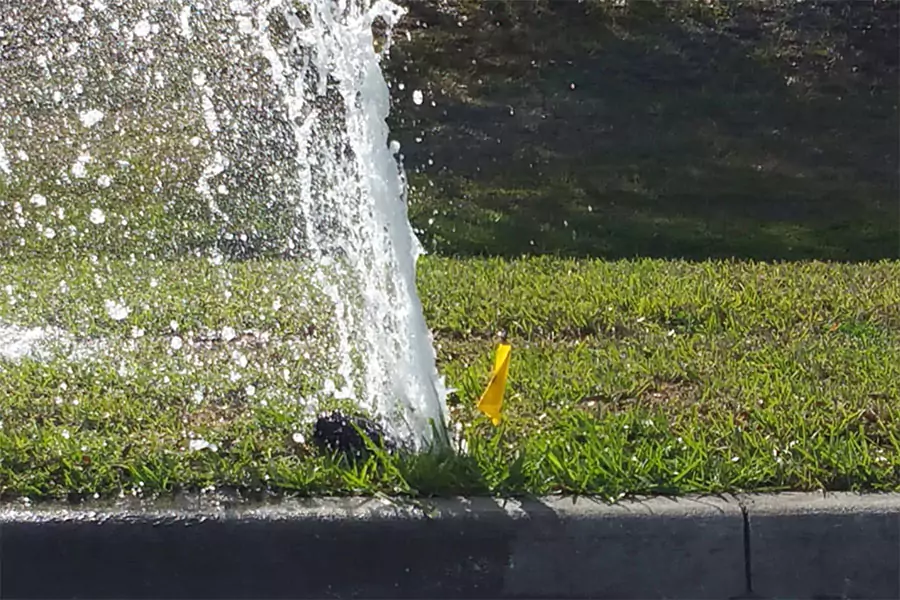 Broken lawn sprinkler head spraying water uncontrollably on grass near curb, showing need for irrigation repair and maintenance in Hebron, KY.